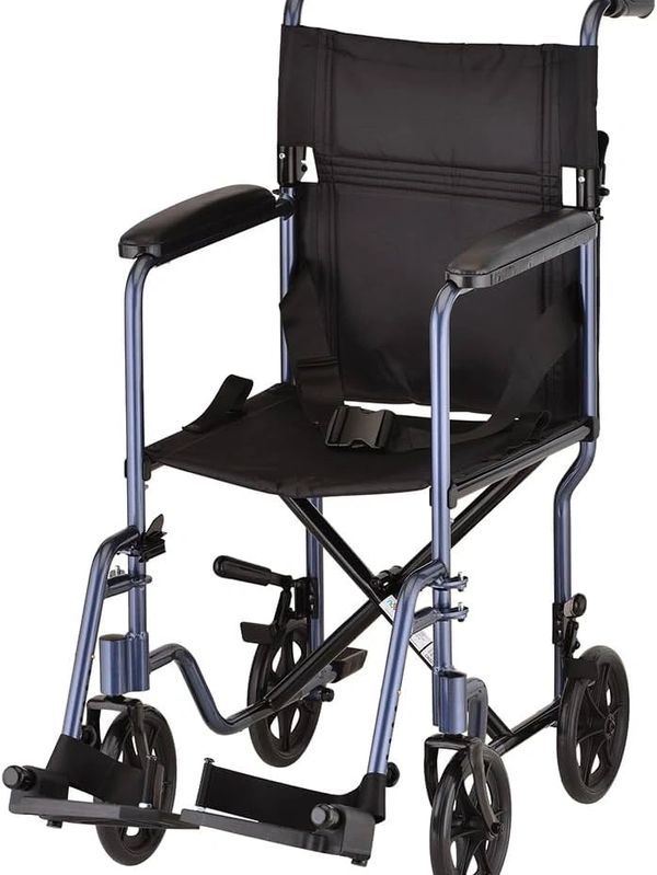 Lightweight and easy to maneuver, this 19" transport chair offers comfort and convenience with swing-away footrests — perfect for travel, hospital visits, or home use.